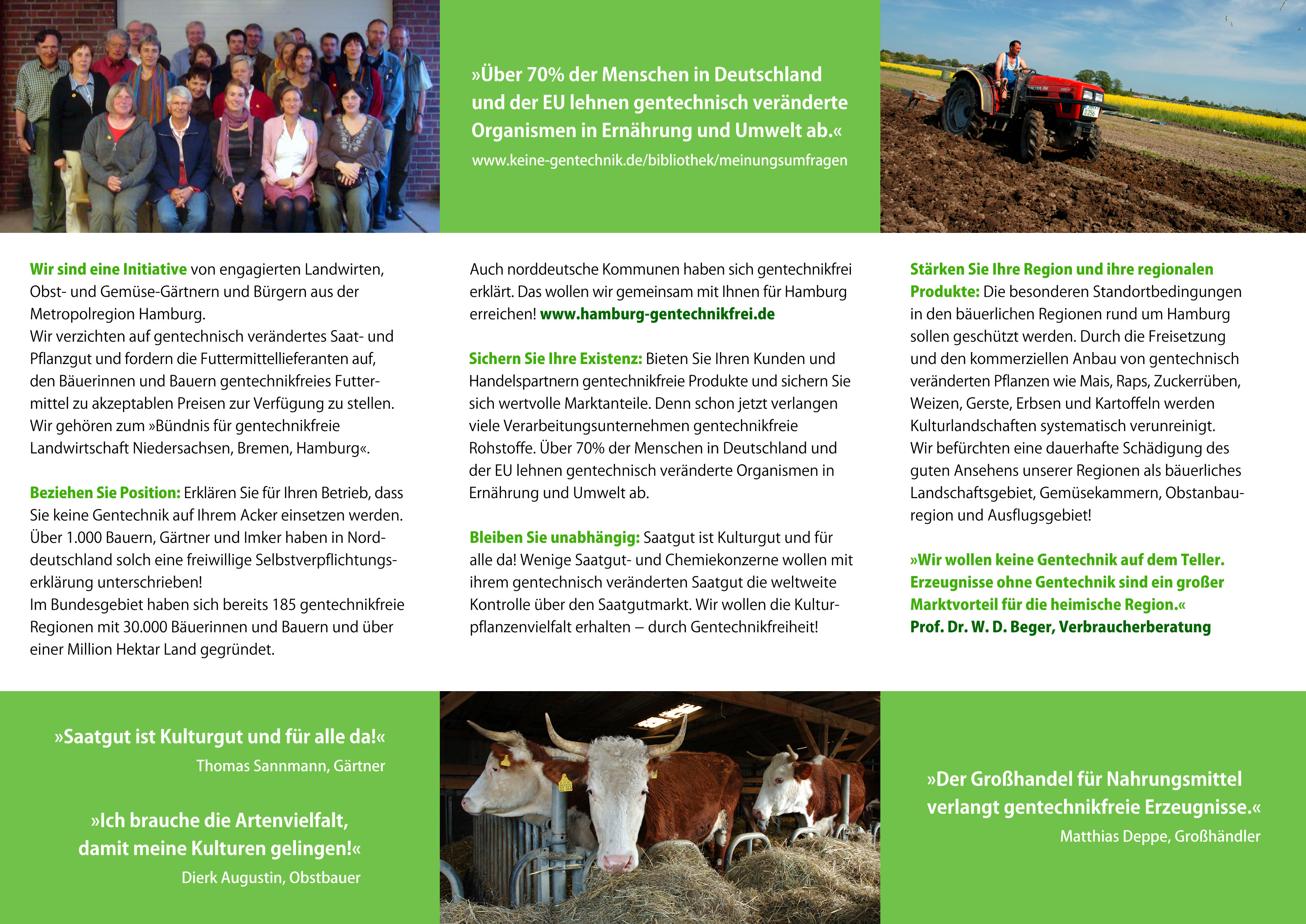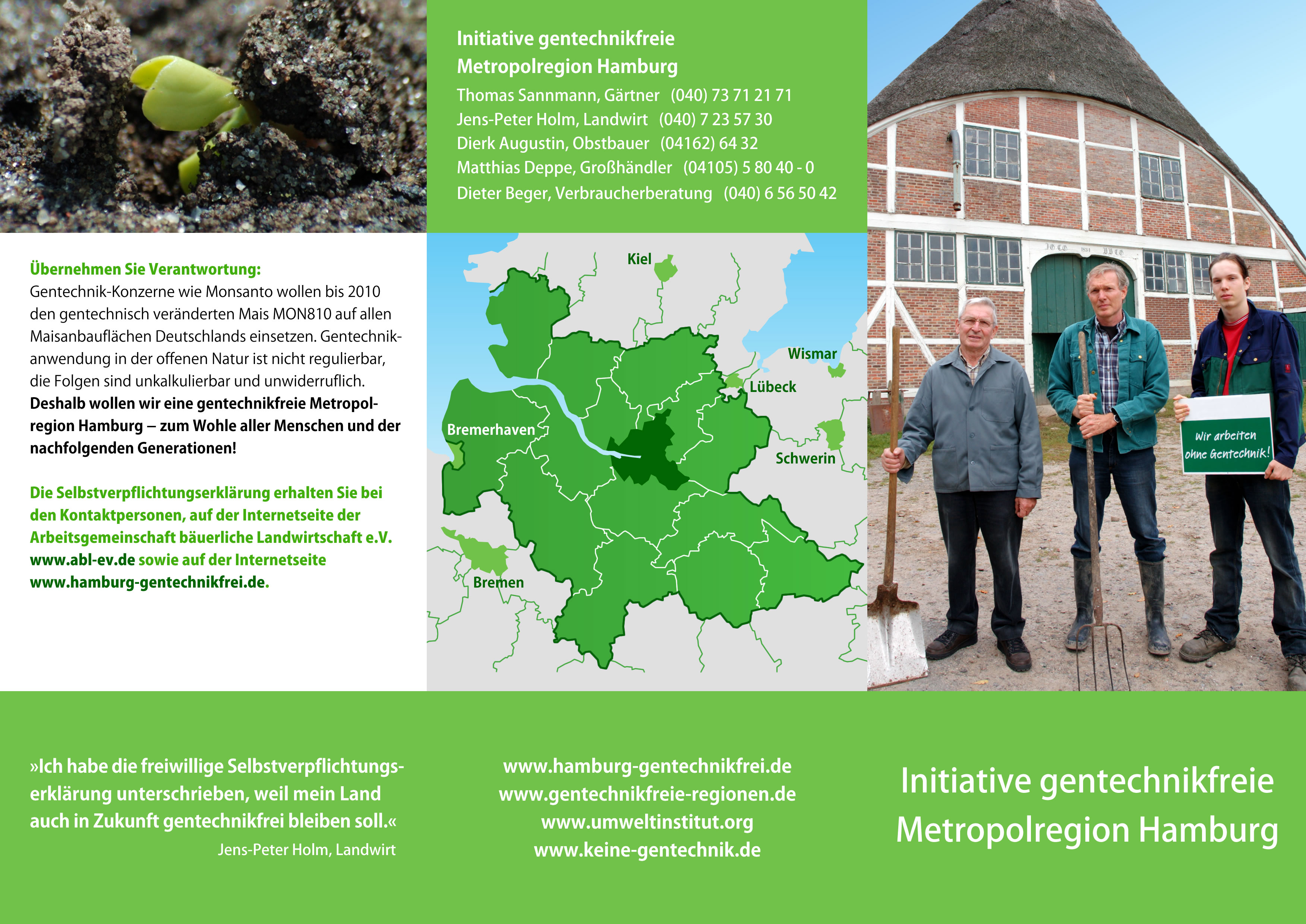 Gentechnik sei “einfach unkontrollierbar”, sagt Landwirt Jens-Peter Holm aus Altengamme in den Hamburger Vier- und Marschlanden. Maispollen würden bis zu 50 Kilometer weit fliegen können, “und dann kommen die irgendwo runter und verseuchen saubere Pflanzen”. Und das sei dann “irreversibel”, sagt Helmut Grimm von der Hamfelder Molkerei in Schleswig-Holstein: “Schon der erste Hektar mit Gentechnik ist der Sündenfall.”