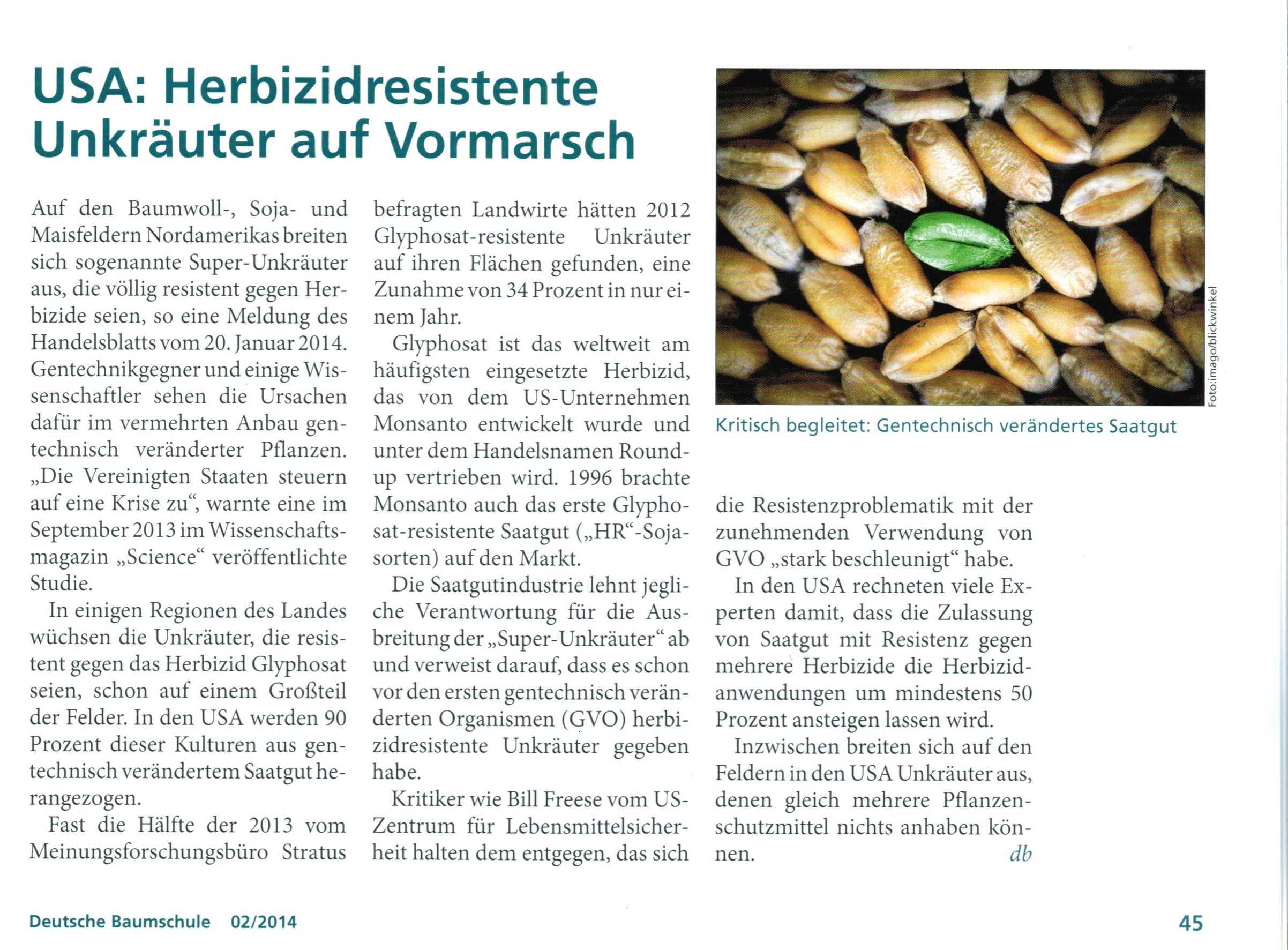 Deutsche Baumschule 02/2014: “USA: Herbizidresistente Unkräuter auf Vormarsch”